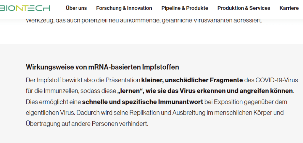 Auch hier wieder der Griff in die rhetorische Trickkiste: Statt „Spike-Proteine“ spricht BioNTech hier von „kleinen, unschädlichen Fragmenten des Covid-19-Virus“. Vielleicht ist bei BioNTech inzwischen angekommen, dass die von ihnen induzierte Produktion von Spike-Proteinen alles andere als klein und unschädlich zu sein scheint? Die Vermeidung des Wortes „Spike-Proteine“ würde ich geradezu als entlarvend für diese Verschleierung ansehen wollen…